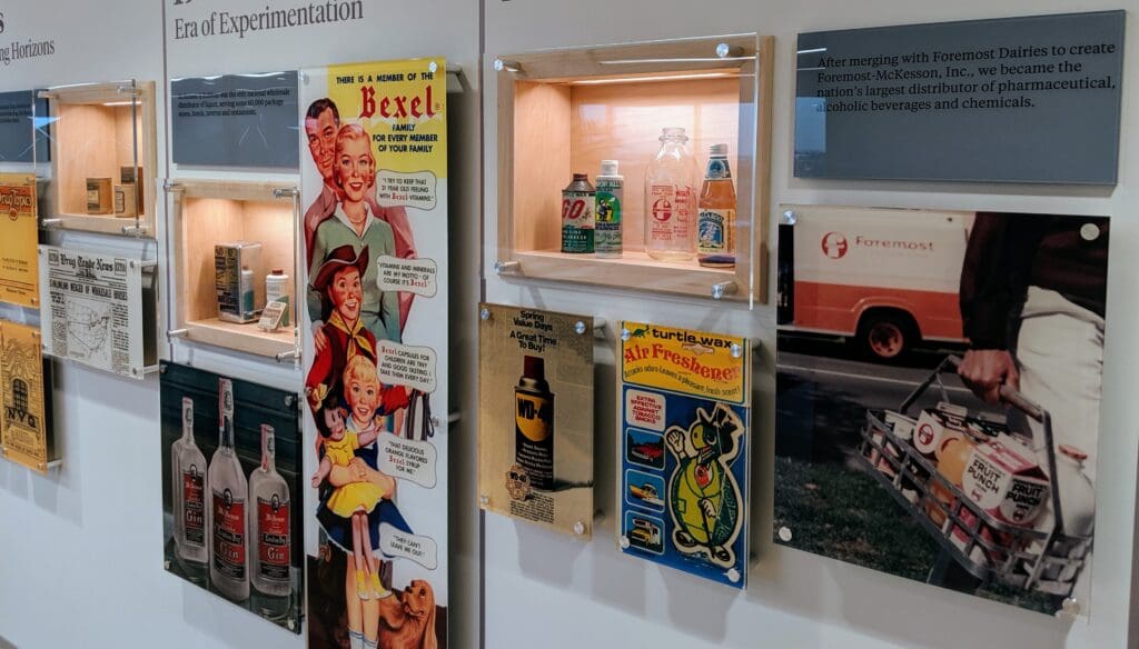 Company history timeline in the executive suite of their Irving, TX headquarters. Custom printed photo acrylics and hand made wooden shadowboxes to display iconic era specific products.